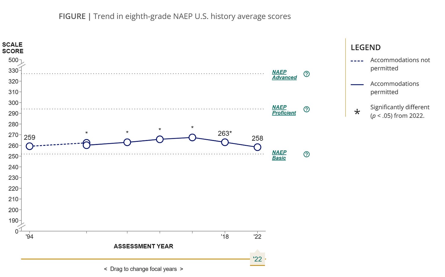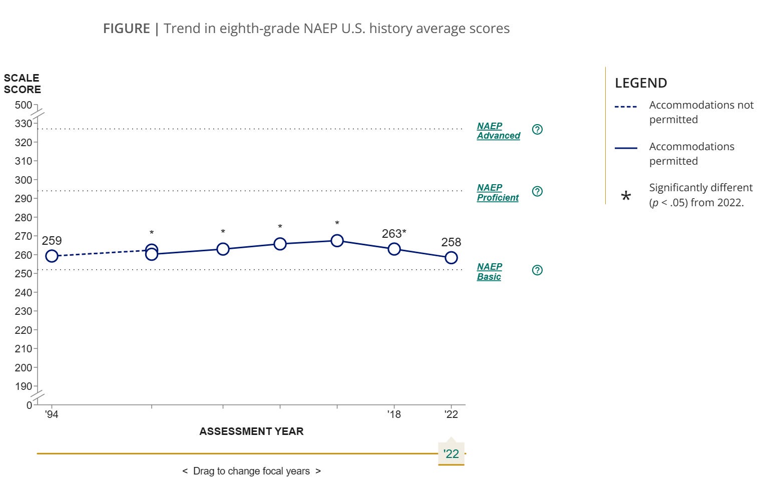 Between 2018 and 2022, U.S. history scores on the National Assessment of Educational Progress (NAEP) fell by an average of 5 points on a 500-point scale. Scores in civics fell by 2 points on a 300-point scale.